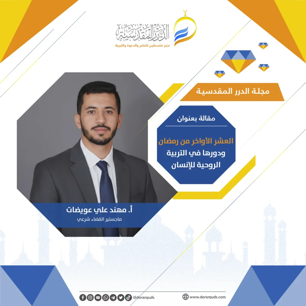 تُعدّ العشر الأواخر من شهر رمضان محطة إيمانية عظيمة في حياة المسلم؛ إذ تتجلى فيها معاني القرب من الله، ومضاعفة الطاعات، وتجديد الصلة بالخالق سبحانه. وقد تميزت هذه الأيام بكونها موسماً للتزكية والإصلاح النفسي والسلوكي، ومجالاً واسعاً لبناء الإنسان روحياً وأخلاقياً.